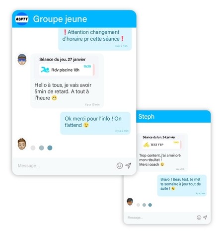 Que ce soit avec vos athlètes ou coach, accédez à un chat de groupe ou indivdualisé relié aux séances d'entraînement.